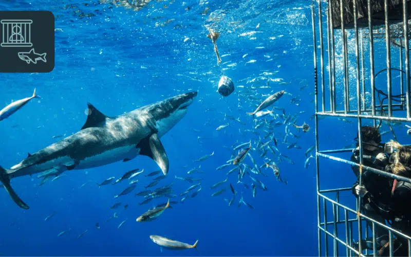 Cage diving is the classic option and the one most first-timers choose. You’re in the water, but separated from sharks by a secure metal cage. It feels safe and controlled, and you still get the full “I’m in the ocean with sharks” moment.